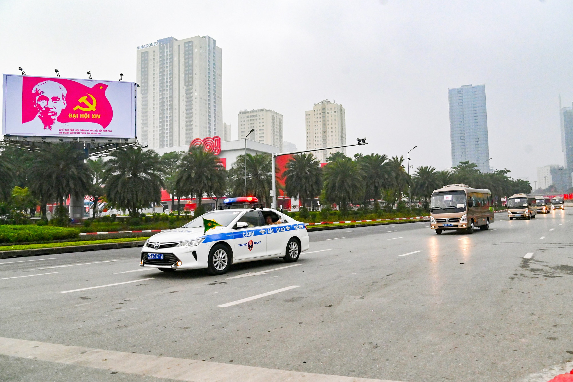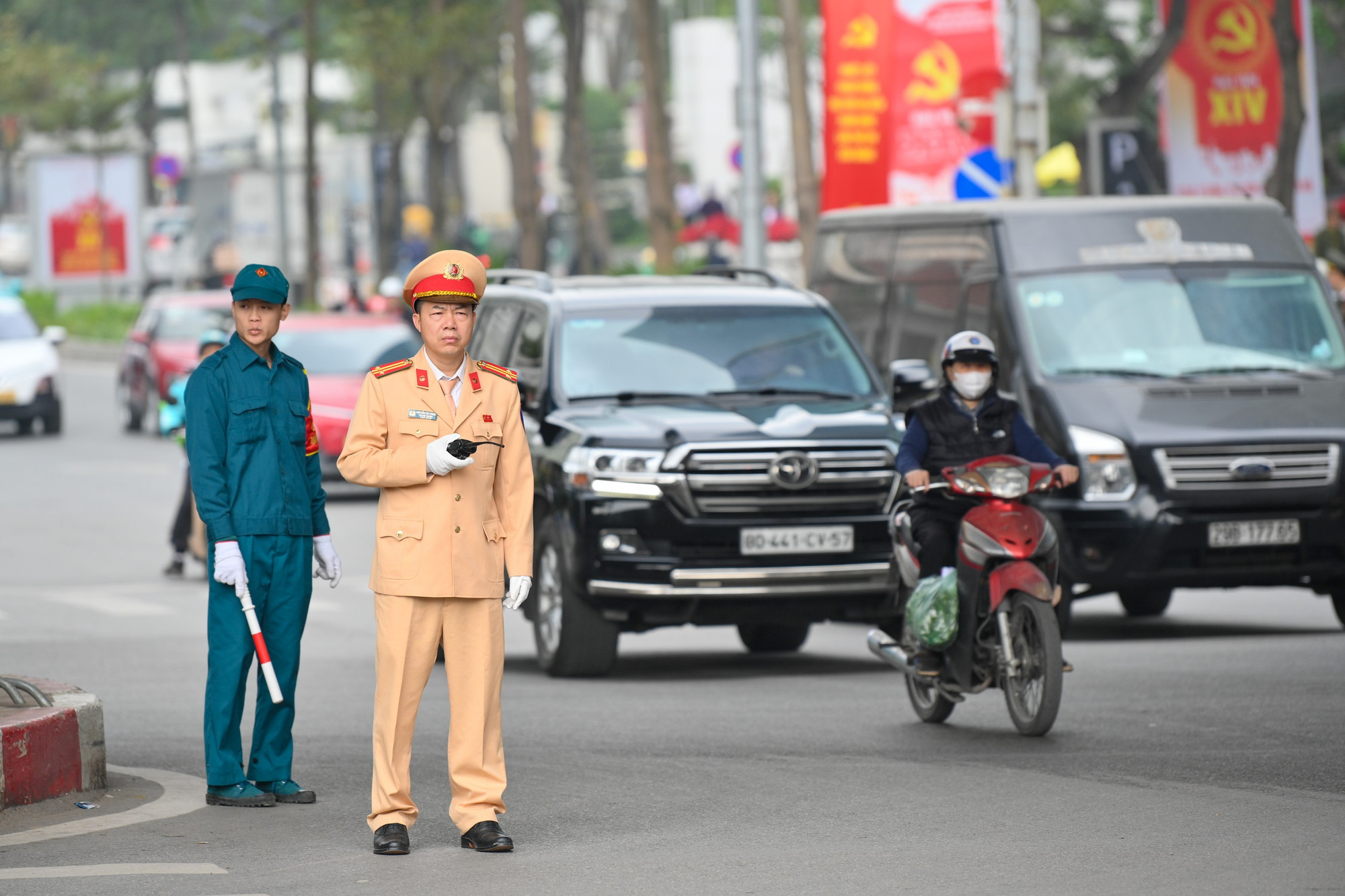 Cảnh sát giao thông dẫn đoàn xe chở đại biểu dự Đại hội trên tuyến Trần Duy Hưng.
