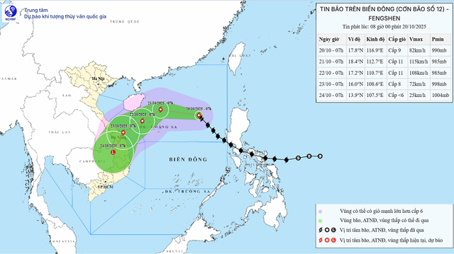 Theo Trung tâm Dự báo KTTV quốc gia, hồi 7 giờ ngày 20/10, vị trí tâm bão số 12 ở vào khoảng 17,8 độ Vĩ Bắc; 116,9 độ Kinh Đông, cách đặc khu Hoàng Sa khoảng 49km về phía Đông Đông Bắc. Sức gió mạnh nhất vùng gần tâm bão mạnh cấp 9 (75-88 km/giờ), giật cấp 11.
