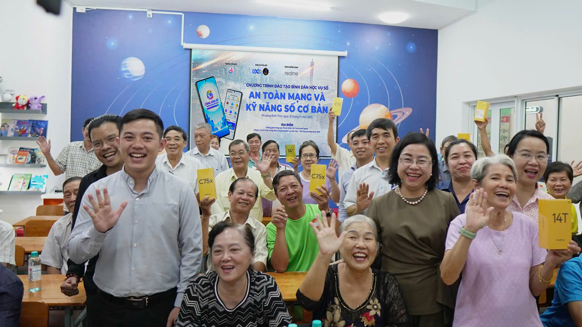 Đáng chú ý, chương trình đã vinh danh 10 học viên tích cực và tiến bộ nhất, đồng thời trao tặng mỗi người một chiếc điện thoại thông minh do Realme hỗ trợ. Đại diện Realme Việt Nam, ông Lê Hoàng – Giám đốc sản phẩm, chia sẻ rằng doanh nghiệp mong muốn đồng hành cùng người dân trên hành trình số hóa, để công nghệ trở thành công cụ hữu ích, gần gũi và an toàn trong cuộc sống hằng ngày.