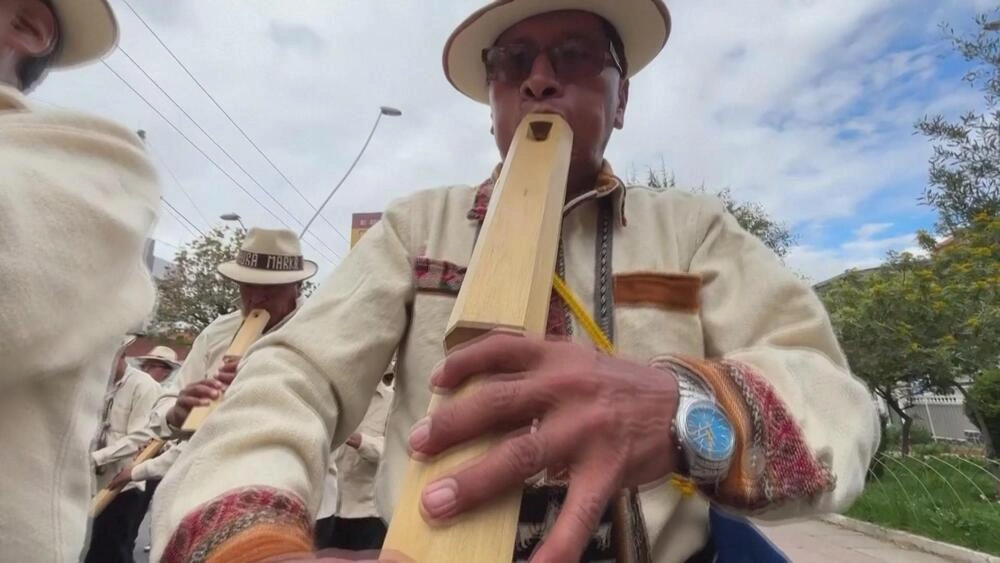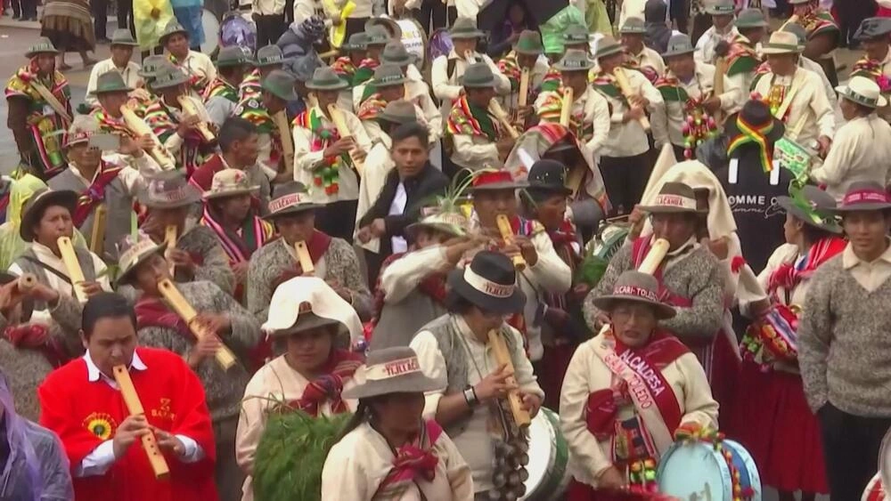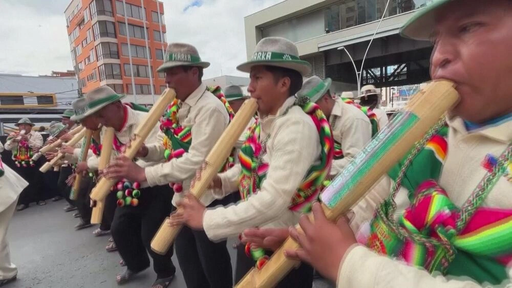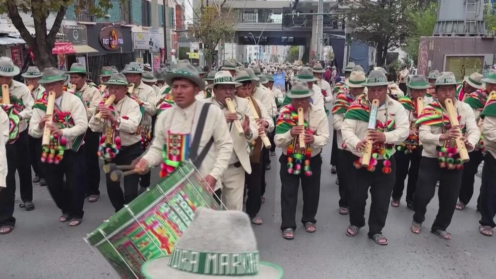 Người dân tụ tập trên phố với sáo và trống, cùng đồng diễn nhạc truyền thống Tarqueada. Đây một hình thức biểu diễn âm nhạc truyền thống của người Bolivia.