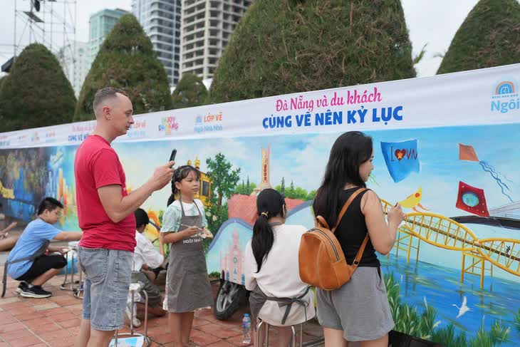 Nhiều người nước ngoài đi qua vị trí đặt bức tranh cũng thích thú và trực tiếp cầm bút vẽ.