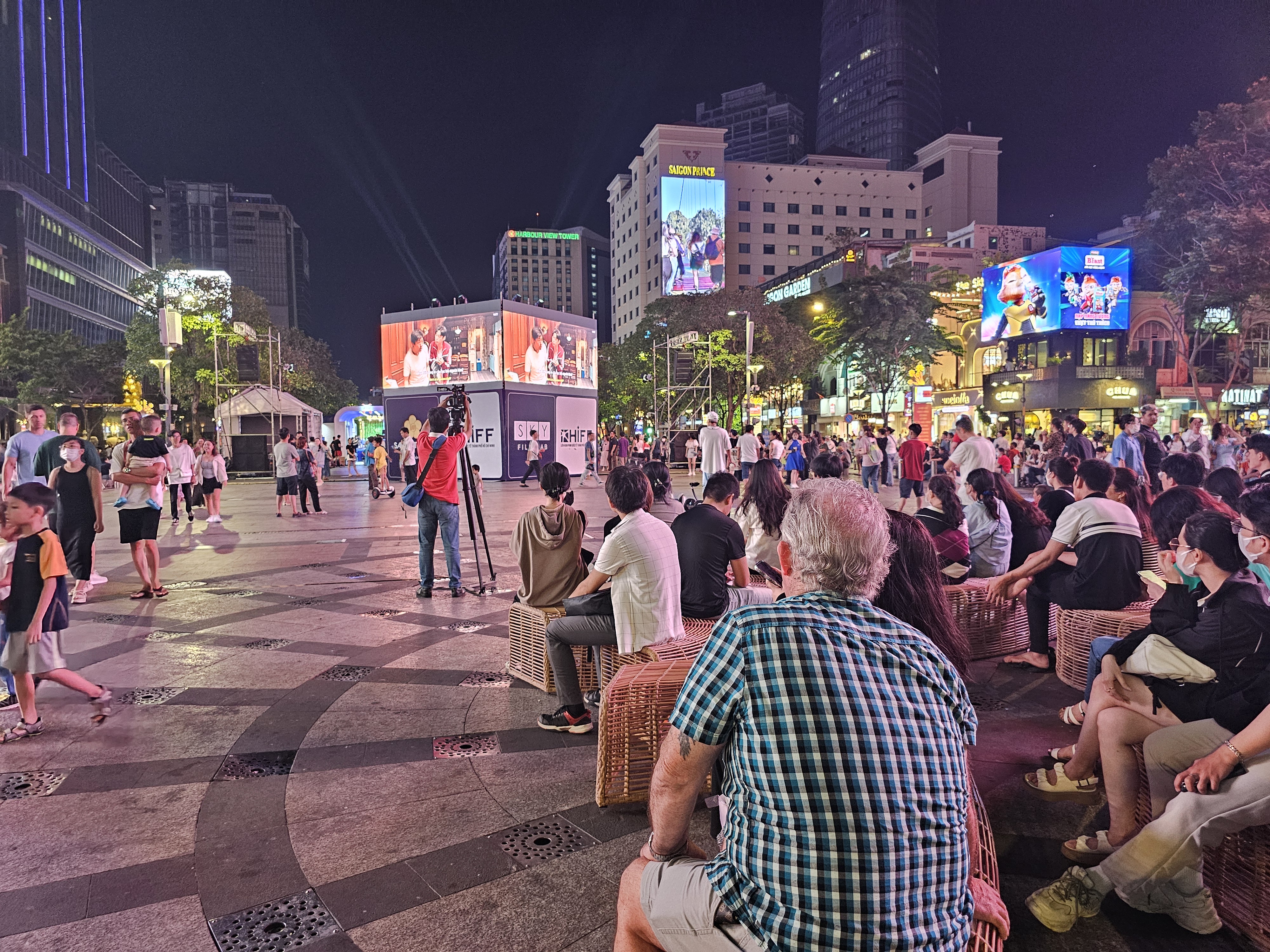 Một trong những điểm chiếu phim ngoài trời Liên hoan Phim năm nay đặt tại Phố đi bộ Nguyễn Huệ, màn hình lớn được dựng lên giữa không gian rộng mở, âm thanh sống động từ phim ảnh đã tạo nên một khung cảnh vô cùng lãng mạn và ấn tượng, đặc biệt, với nhiều khán giả trẻ. Khác với trong rạp chiếu phim thông thường trong nhà, hình thức chiếu phim này đã mang đến bầu không khí sống động và gần gũi, thu hút các khán giả cùng nhau thưởng thức bộ phim yêu thích và trò chuyện, chia sẻ cảm xúc một cách thoải mái.