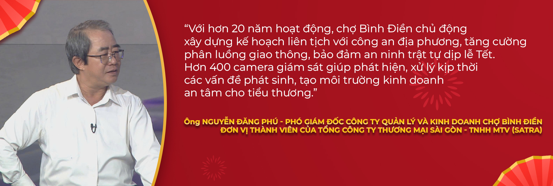 Hoạt động chủ yếu về đêm, lưu lượng người và phương tiện lớn, đặc biệt tăng mạnh vào dịp cận Tết, khiến công tác đảm bảo an ninh trật tự tại chợ Bình Điền luôn được đặt lên hàng đầu. Theo đại diện Ban quản lý chợ, đơn vị đã xây dựng kế hoạch phối hợp liên ngành với Công an phường Bình Đông và các lực lượng an ninh cơ sở nhằm chủ động phòng ngừa, xử lý kịp thời các tình huống phát sinh.