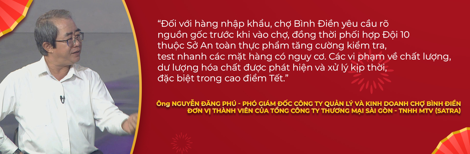 Cùng với an ninh trật tự, an toàn vệ sinh thực phẩm là vấn đề được chợ Bình Điền đặc biệt chú trọng, nhất là trong bối cảnh lượng hàng hóa tăng đột biến dịp Tết. Theo thống kê, trung bình mỗi năm chợ thực hiện kiểm tra, test nhanh khoảng 1.400 mẫu hàng hóa có nguy cơ. Riêng trong tháng cao điểm trước Tết, tần suất kiểm tra được tăng gấp đôi, thậm chí gấp ba lần đối với một số nhóm hàng nhạy cảm.
