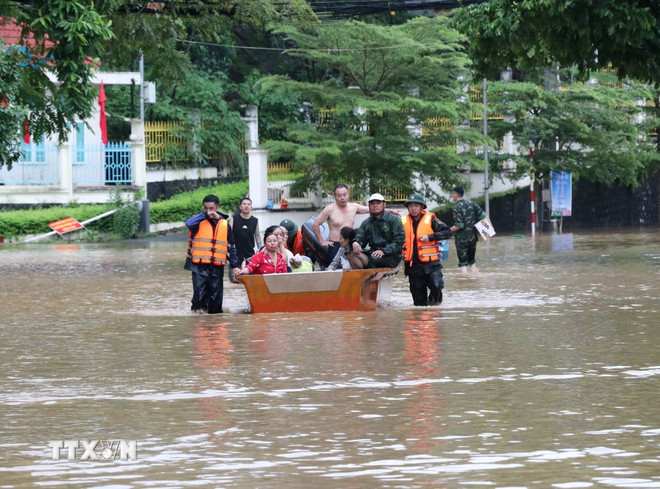 Bộ đội biên phòng Tuyên Quang giúp sơ tán người dân đến nơi an toàn. (Ảnh: Đức Thọ/TTXVN)