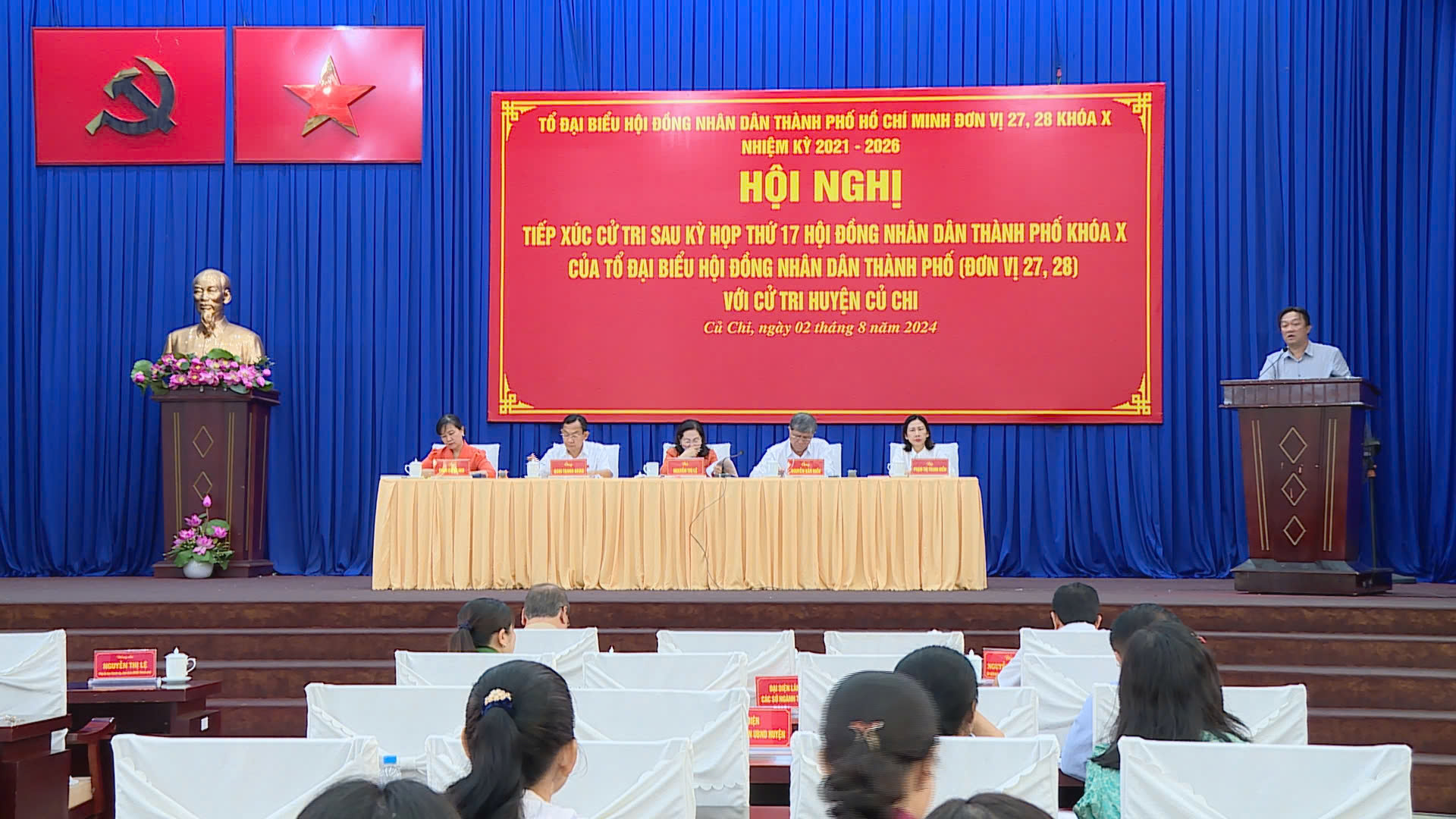 Đại diện UBND huyện Củ Chi đã trả lời trực tiếp cử tri những kiến nghị thuộc thẩm quyền. Theo đó, huyện sẽ tiếp tục đầu tư hệ thống chiếu sáng, thoát nước tại các tuyến đường. Về vấn nạn tiếng ồn trong khu dân cư, huyện sẽ tiến hành thanh tra và xử lý nghiêm những trường hợp vi phạm. Thay mặt tổ Đại biểu HĐND TP.HCM, Phó Bí thư Thành ủy, Chủ tịch HĐND TP.HCM Nguyễn Thị Lệ ghi nhận và có những giải đáp đến cử tri đối với từng vấn đề được nêu tại buổi tiếp xúc.