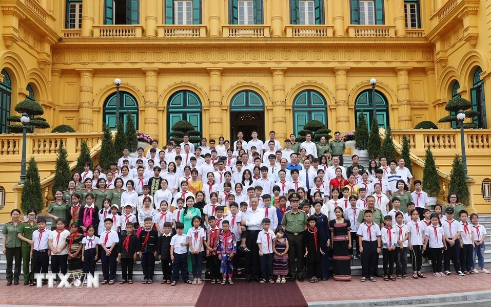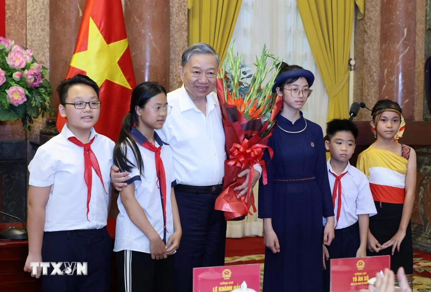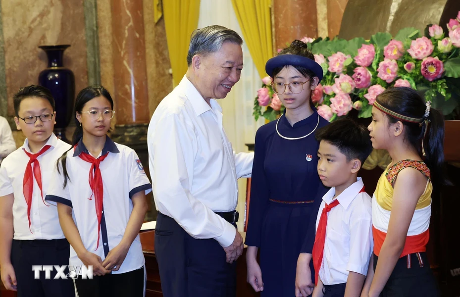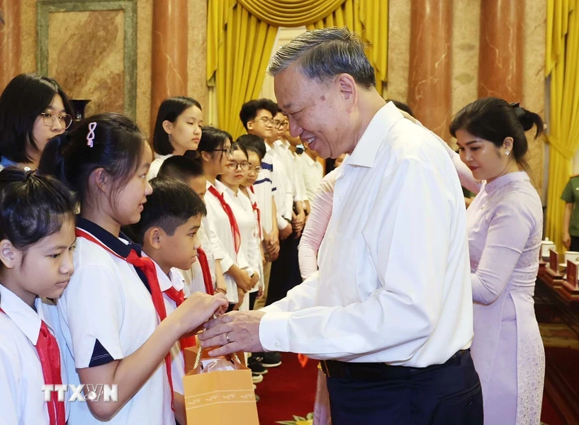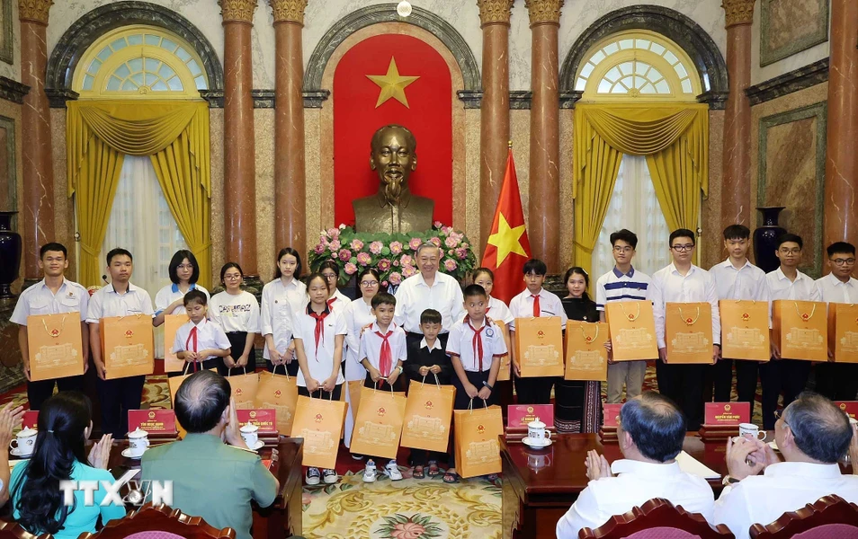 Chủ tịch nước Tô Lâm tặng quà cho các thanh thiếu niên tiêu biểu