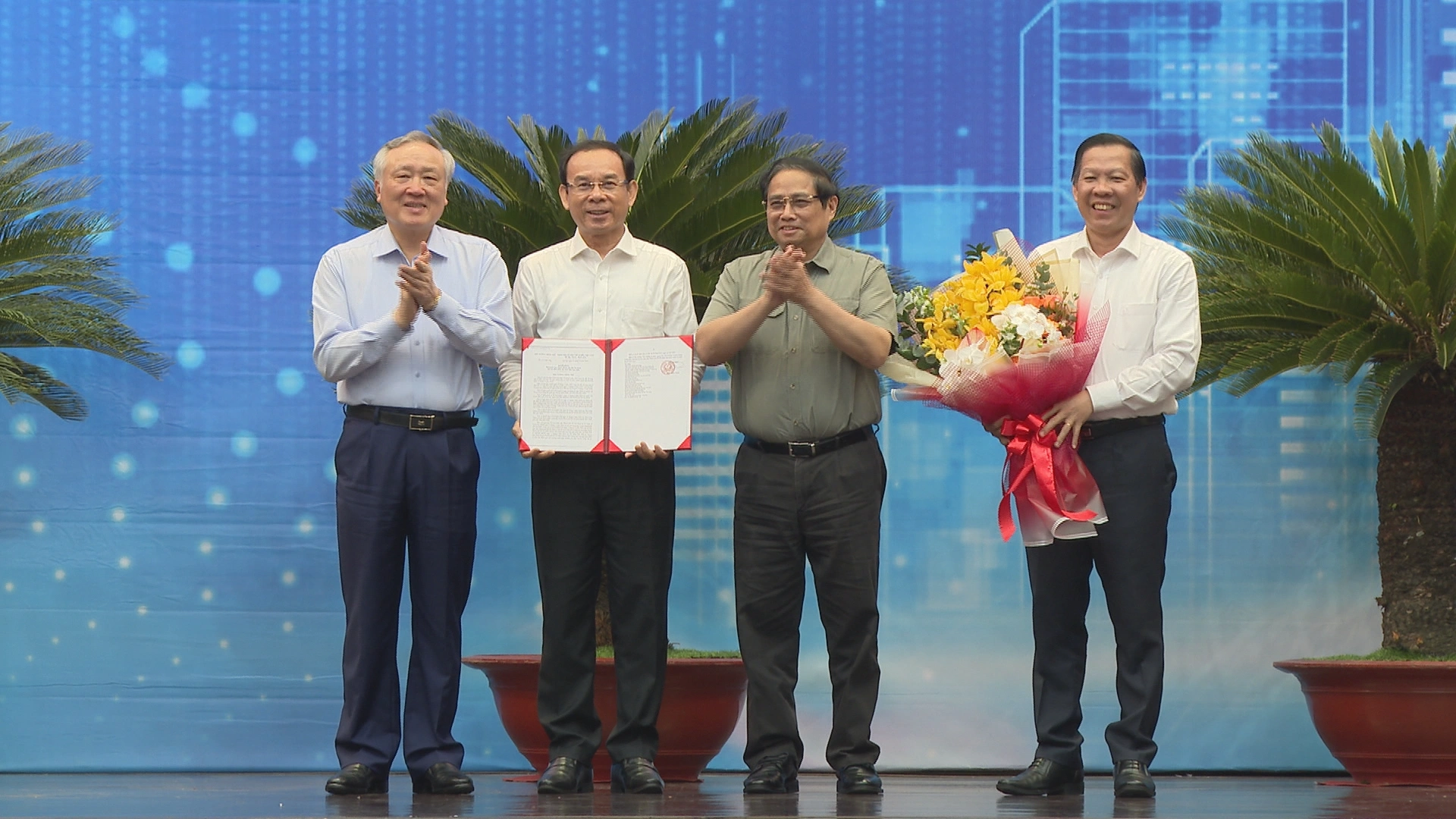 Dịp này, Thủ tướng Phạm Minh Chính và Phó Thủ tướng Thường trực Chính phủ Nguyễn Hòa Bình đã trao quyết định phê duyệt quy hoạch TP.HCM thời kỳ 2021-2030, tầm nhìn đến năm 2050 cho lãnh đạo TP.HCM.