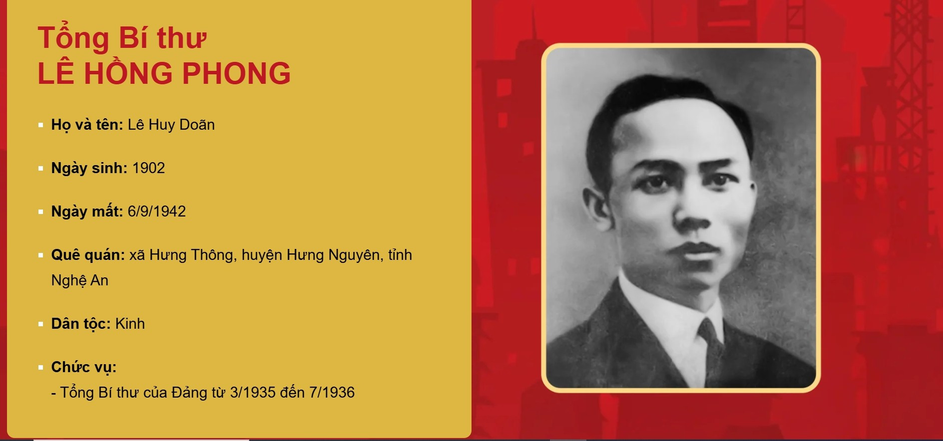 Diễn ra từ ngày 27-31/3/1935, tại Macau (Trung Quốc), Đại hội đại biểu toàn quốc lần thứ nhất của Đảng có 13 đại biểu thuộc các đảng bộ trong nước và tổ chức của Đảng hoạt động ở ngoài nước tham dự. Đại hội đã bầu đồng chí Lê Hồng Phong làm Tổng Bí thư.