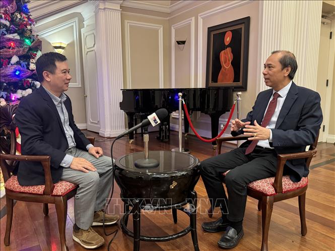 Đại sứ Việt Nam tại Mỹ Nguyễn Quốc Dũng trả lời phỏng vấn của TTXVN trước thềm Đại hội đại biểu toàn quốc Đảng Cộng sản Việt Nam lần thứ XIV. Ảnh: Đoàn Hùng/TTXVN