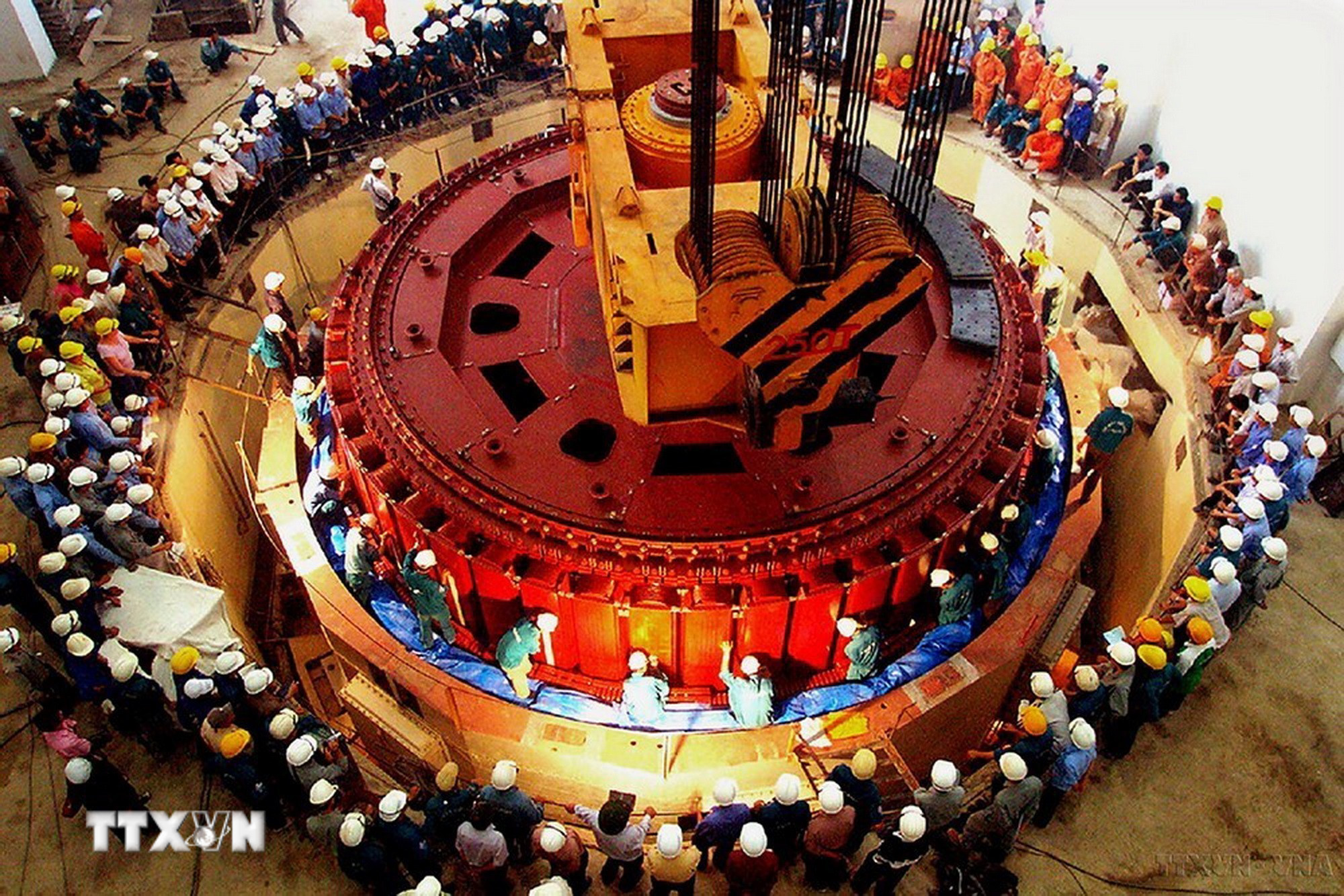 Lắp đặt rotor tổ máy số 1, công trình Thủy điện Sê San 3 (Gia Lai), năm 2009. Suốt những năm đổi mới, ngành điện không ngừng nỗ lực, sáng tạo, lập những kỳ tích mới, thực hiện tốt sứ mệnh là một trong những trụ cột lớn của nền kinh tế, đáp ứng nhu cầu điện phục vụ sự nghiệp công nghiệp hóa, hiện đại hóa. (Ảnh: Sỹ Huynh/TTXVN)