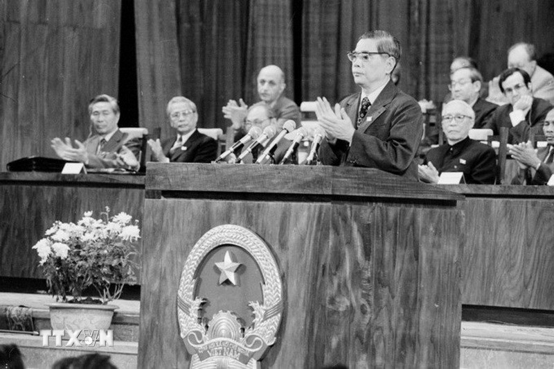 Phát biểu tại Đại hội VI sau khi được bầu làm Tổng Bí thư của Đảng, đồng chí Nguyễn Văn Linh nhấn mạnh Đại hội lần này đã đánh dấu bước chuyển quan trọng trong quá trình kế thừa và đổi mới sự lãnh đạo của Đảng. Ông cũng thể hiện quyết tâm: "Không một trở lực nào có thể ngăn cản bước tiến của chúng ta về phía trước." (Ảnh: TTXVN)