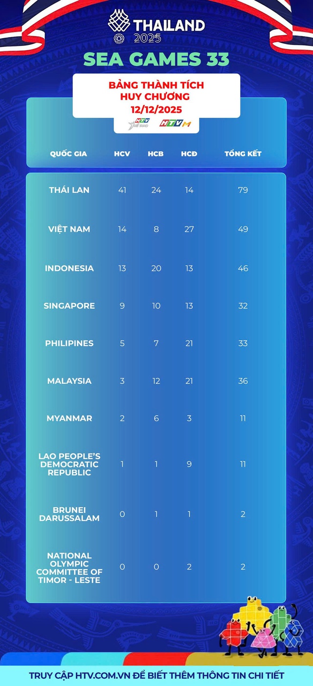 Kết thúc ngày thi đấu, Đoàn Thể thao Việt Nam đã có tổng cộng 14 HCV, 8 HCB và 27 HCĐ, vươn lên vị trí thứ hai trên bảng tổng sắp huy chương, khẳng định quyết tâm bảo vệ vị thế của mình tại Đại hội.