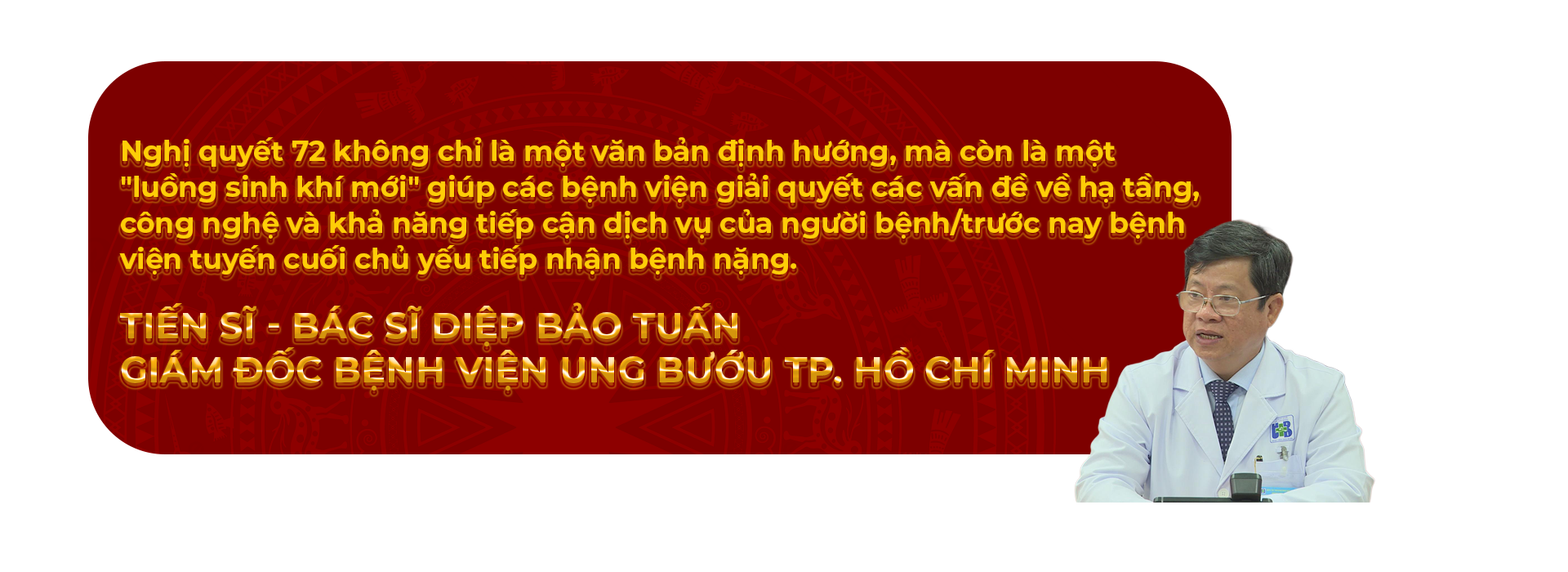 Theo Nghị quyết 72, từ năm 2026, người dân sẽ được khám sức khỏe định kỳ hoặc sàng lọc miễn phí ít nhất một lần mỗi năm; hướng tới miễn viện phí cơ bản trong phạm vi quyền lợi bảo hiểm y tế vào năm 2030, và xa hơn là mục tiêu miễn viện phí toàn dân. Khi mục tiêu này được hiện thực hóa, sẽ mang lại nhiều ý nghĩa xã hội đối với bệnh nhân ung thư và các bệnh viện chuyên khoa.