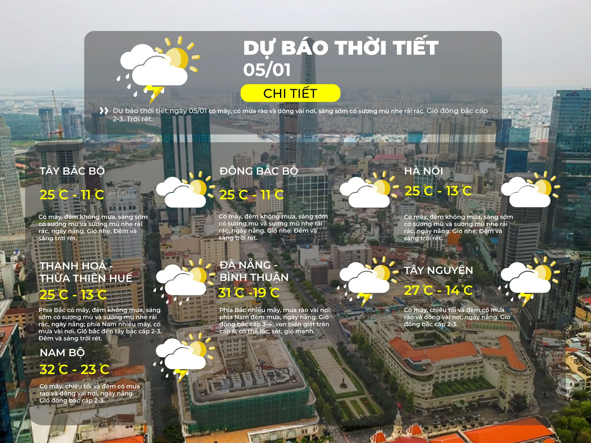 Phía Bắc nhiều mây, có mưa rào và dông vài nơi; phía Nam có mây, đêm có mưa rào và dông vài nơi, ngày nắng. Gió Đông Bắc cấp 3-4, vùng ven biển có nơi có khả năng có gió giật mạnh trên cấp 6. Trong mưa dông có khả năng xảy ra lốc, sét và gió giật mạnh. Nhiệt độ thấp nhất từ 19-21 độ, phía Nam 22-24 độ. Nhiệt độ cao nhất từ 23-26 độ; phía Nam 28-31 độ, có nơi trên 31 độ.