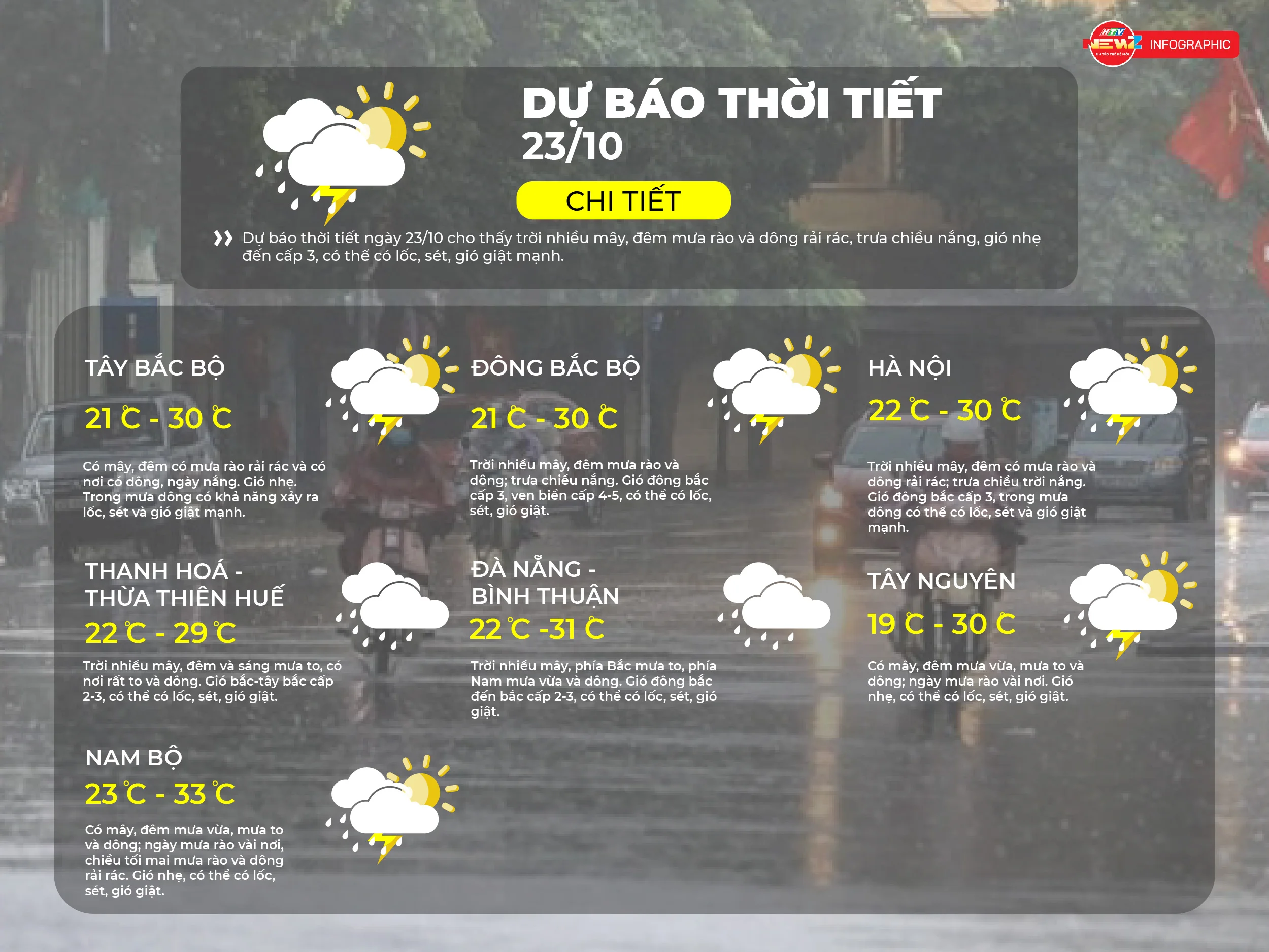 Nhiều mây, phía Bắc đêm và sáng có mưa vừa, mưa to và rải rác có dông, cục bộ có nơi mưa rất to; phía Nam đêm có mưa, mưa vừa và rải rác có dông, cục bộ có nơi mưa to, ngày có mưa rào và dông vài nơi. Gió đông bắc đến bắc cấp 2-3. Trong mưa dông có khả năng xảy ra lốc, sét và gió giật mạnh. Nhiệt độ thấp nhất từ: 22-25 độ. Nhiệt độ cao nhất từ: 28-31 độ.