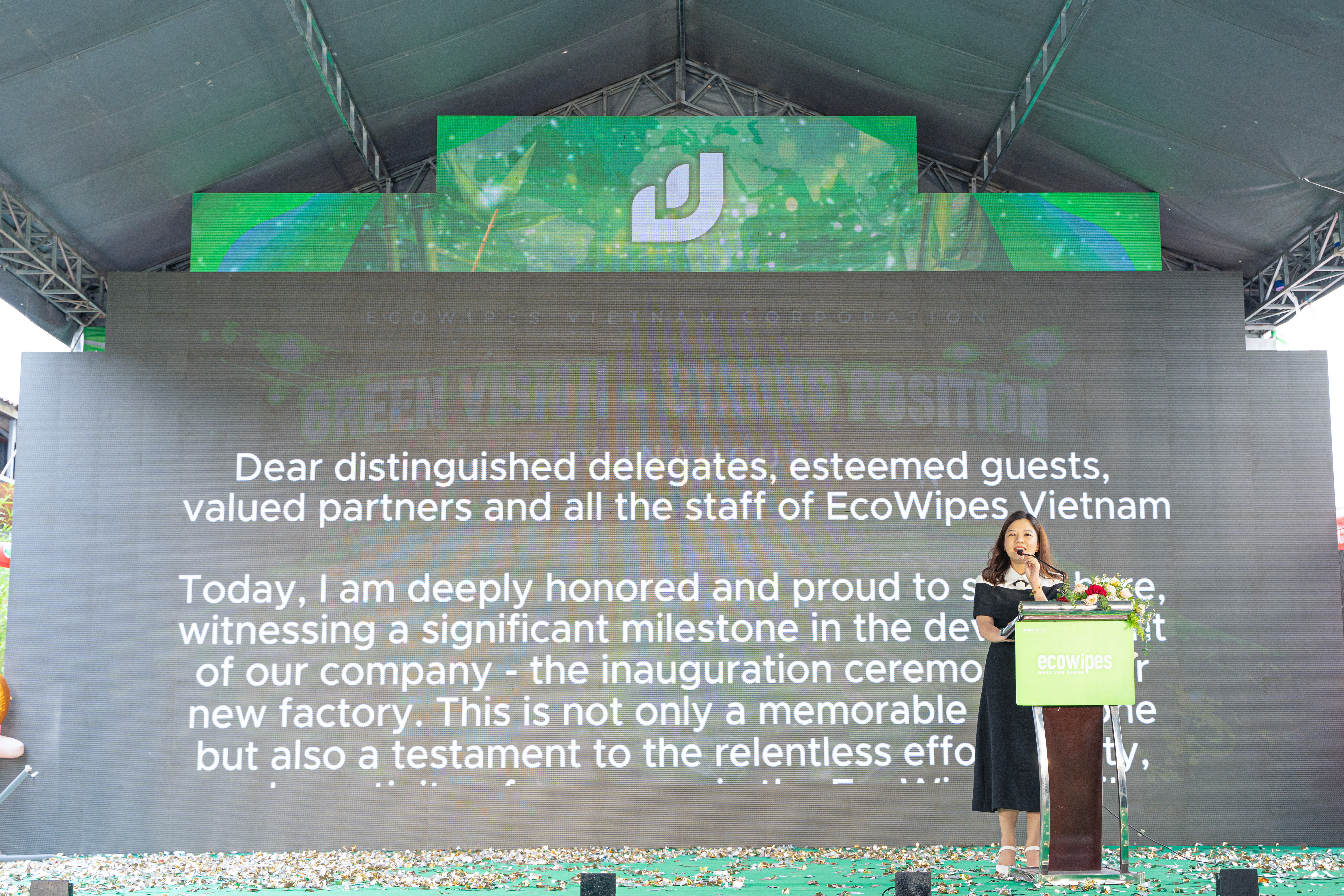 Tại buổi lễ, bà Lê Thị Bảo Yến - Tổng giám đốc EcoWipes Việt Nam, chia sẻ công ty đã đầu tư dây chuyền công nghệ mới nhất để mở rộng sản xuất, tăng sản lượng và nâng cao chất lượng khăn ướt. Đây là cột mốc quan trọng đánh dấu sự phát triển và khẳng định uy tín của công ty trên thị trường.