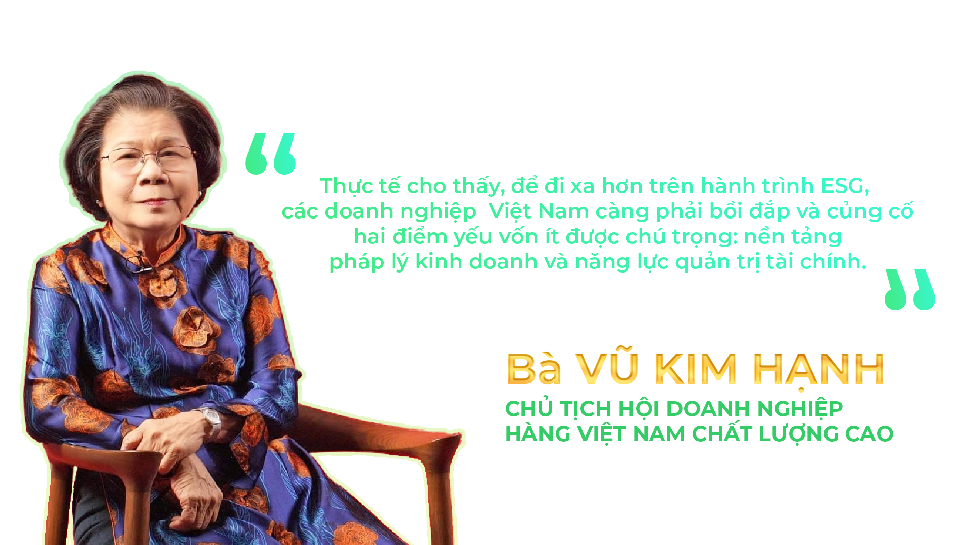 Bà Vũ Kim Hạnh - Chủ tịch Hội Doanh nghiệp hàng Việt Nam chất lượng cao, nhận định việc tiếp cận tài chính cho các hoạt động ESG thường khó hơn so với huy động vốn kinh doanh thông thường. Theo bà, lý do là vì ESG không chỉ đòi hỏi tiền bạc mà còn yêu cầu sự thấu hiểu và hướng dẫn thực chiến. Bà cũng chỉ ra rằng thực tế đòi hỏi doanh nghiệp Việt Nam phải chú trọng bồi đắp kiến thức, kỹ năng ở hai lĩnh vực thường bị xem nhẹ là pháp lý kinh doanh và quản trị tài chính.