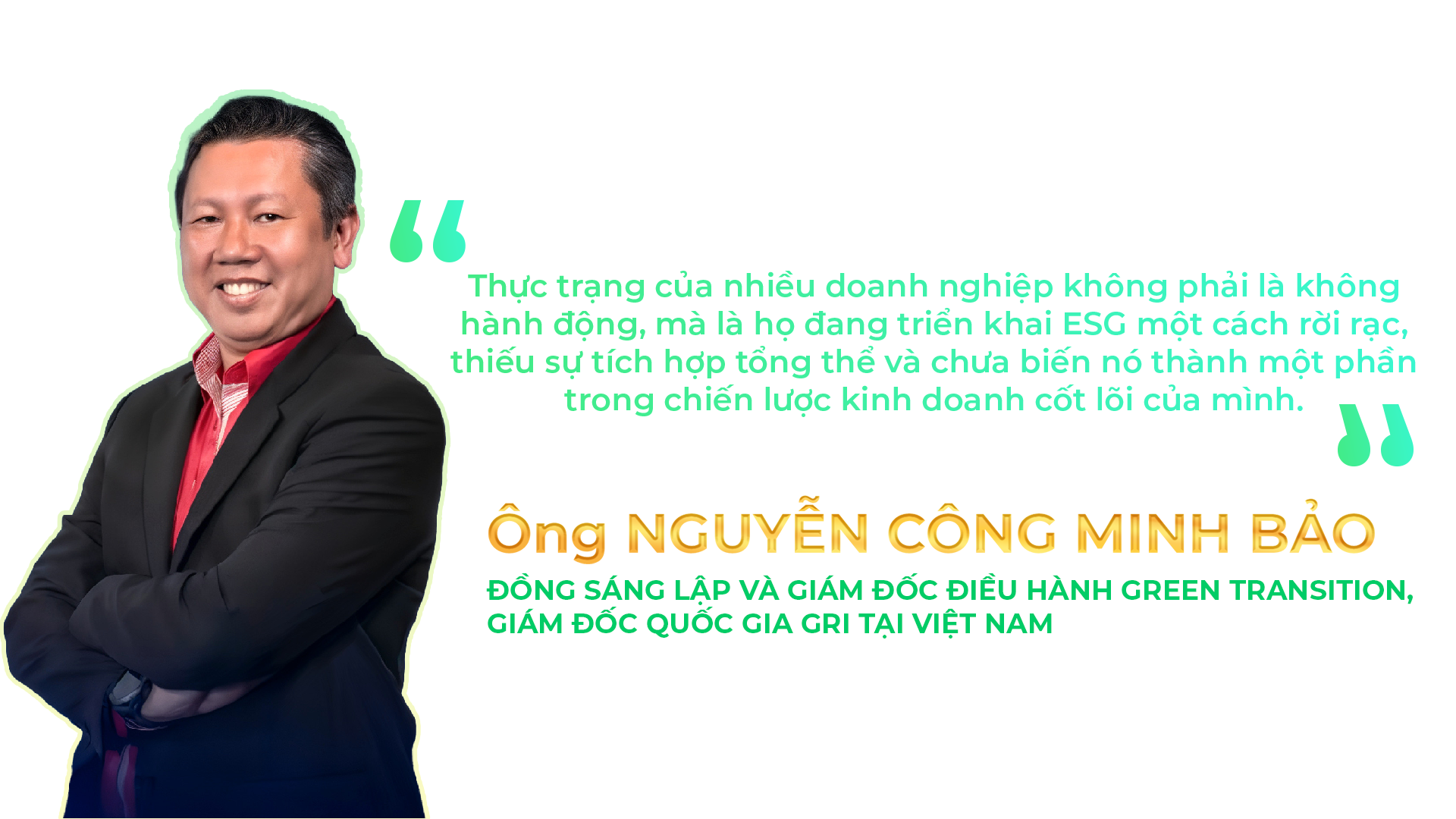 Ông Nguyễn Công Minh Bảo đã chia sẻ về khung làm việc 5 bước của Green Transition trong việc định hướng lộ trình chuyển đổi xanh cho doanh nghiệp. Bước đầu tiên là "Nâng cao nhận thức đúng đắn thông qua đào tạo" Bước thứ hai là "Tuân thủ", không chỉ về luật pháp, tiêu chuẩn quốc tế hay yêu cầu chuỗi cung ứng, mà còn phải tích hợp vào chiến lược kinh doanh và quản lý rủi ro. Bước thứ ba, thường bị các doanh nghiệp bỏ qua, là "Xây dựng nền tảng thông qua đánh giá ban đầu" để tạo dựng uy tín. Bước thứ tư là "Triển khai giải pháp" một cách có hệ thống sau khi đã có nền tảng vững chắc, giúp doanh nghiệp ưu tiên hóa các hạng mục hiệu quả. Bước cuối cùng là "Tiếp cận vốn xanh".