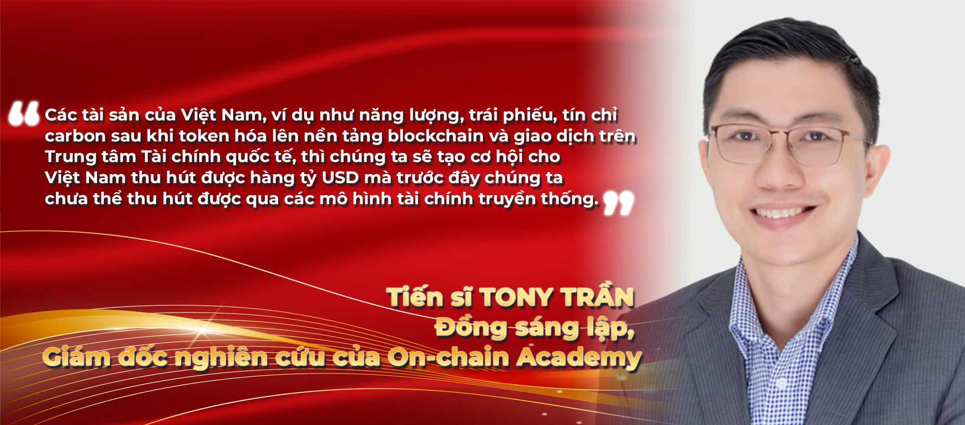 Để hiện thực hóa mục tiêu này, Tiến sĩ Tony Trần đề xuất ưu tiên xây dựng một nền tảng số toàn diện, cho phép "token hóa" các tài sản của Việt Nam và đưa lên blockchain một cách nhanh chóng, an toàn. Ông đặc biệt nhấn mạnh sự cần thiết của các sàn giao dịch chuyên biệt cho từng loại tài sản như tín chỉ carbon, bất động sản hay tài sản thực. Đây sẽ là kênh phân phối hiệu quả để chào bán các sản phẩm tài chính số của Việt Nam ra thị trường quốc tế.