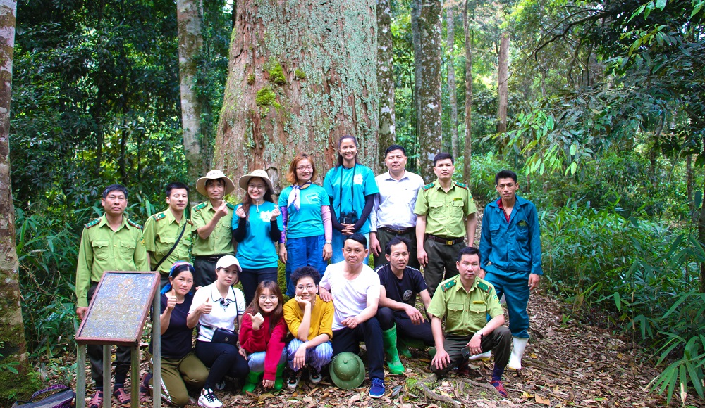 Hoa hậu H'Hen Niê chụp hình lưu niệm bên cây "cụ cây" Pơ-mu 1.500 tuổi cùng đội ngũ Gaia và cán bộ Khu Bảo tồn Thiên Nhiên Xuân Liên