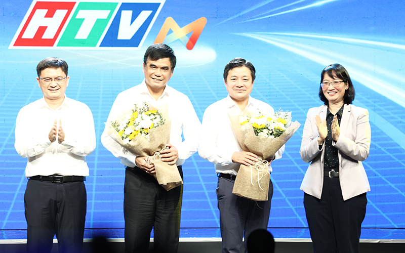 Ông Nguyễn Mạnh Cường - Trưởng Ban Tuyên giáo và Dân vận Thành ủy cùng bà Trần Thị Diệu Thúy - Thành ủy viên Ban Thường vụ Thành ủy, Phó Chủ tịch UBND TP.HCM trao hoa đến hai vị Tổng Giám đốc của HTV và VNPT