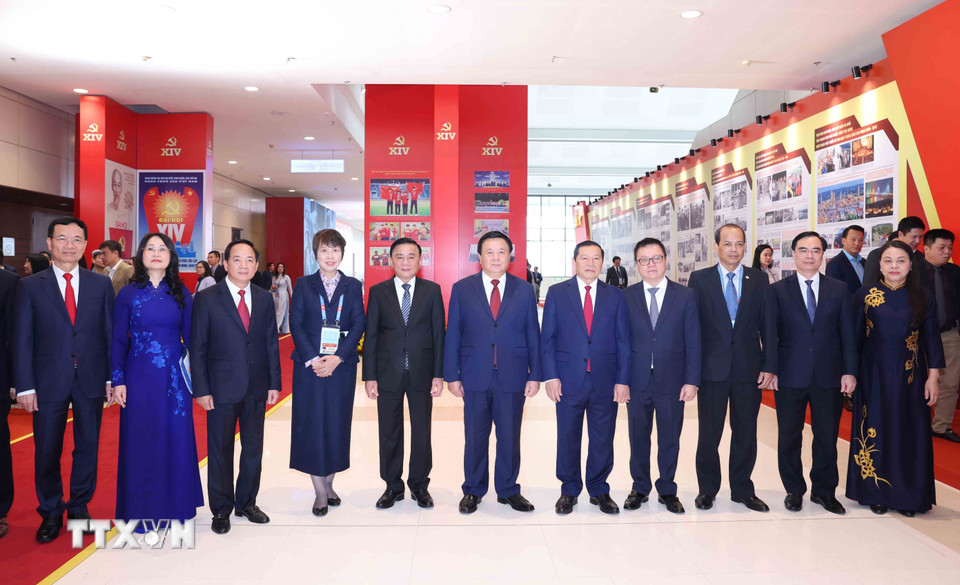Lãnh đạo Đảng, Nhà nước đến dự họp báo và khai trương Trung tâm Báo chí Đại hội XIV. (Ảnh: Minh Quyết/TTXVN)