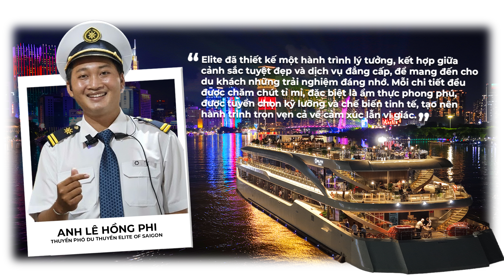 Là một trong những du thuyền nổi bật tại TP. Hồ Chí Minh, Elite of Saigon mang đến cho du khách hành trình thư giãn trên dòng sông mang đậm dấu ấn lịch sử và nhịp sống hiện đại. Từ ánh hoàng hôn phủ lên mặt nước đến những tòa nhà lung linh khi đêm xuống – mỗi khoảnh khắc trên sông đều gợi nên cảm xúc riêng. Trên du thuyền, du khách có thể thưởng thức ẩm thực tinh tế, ngắm nhìn thành phố chuyển mình, và cảm nhận sự hòa quyện giữa thiên nhiên và con người. Không chỉ là một sản phẩm du lịch, những chuyến đi như thế còn góp phần định hình diện mạo mới cho du lịch đường sông – hướng đến hình ảnh TP. Hồ Chí Minh năng động, hiện đại và đáng sống.