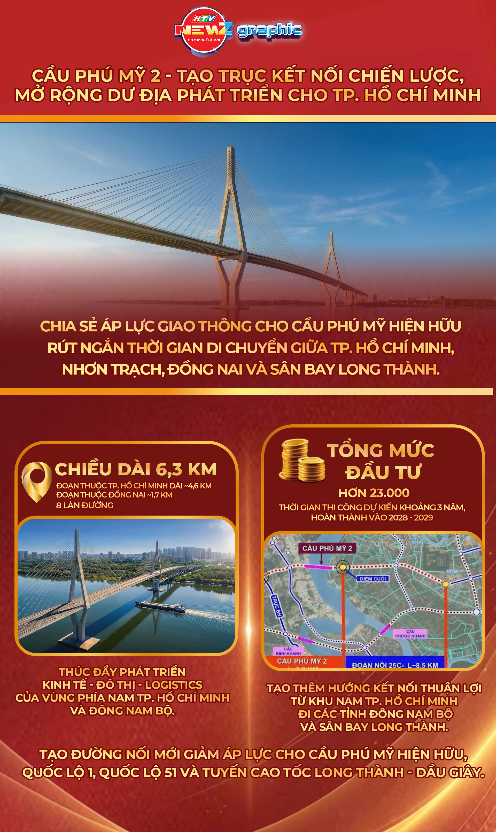 Dự án xây dựng cầu Phú Mỹ 2 cũng được triển khai, góp phần hoàn thiện hệ thống giao thông trục Đông - Tây, tăng cường liên kết vùng và giảm tải cho các tuyến đường hiện hữu.