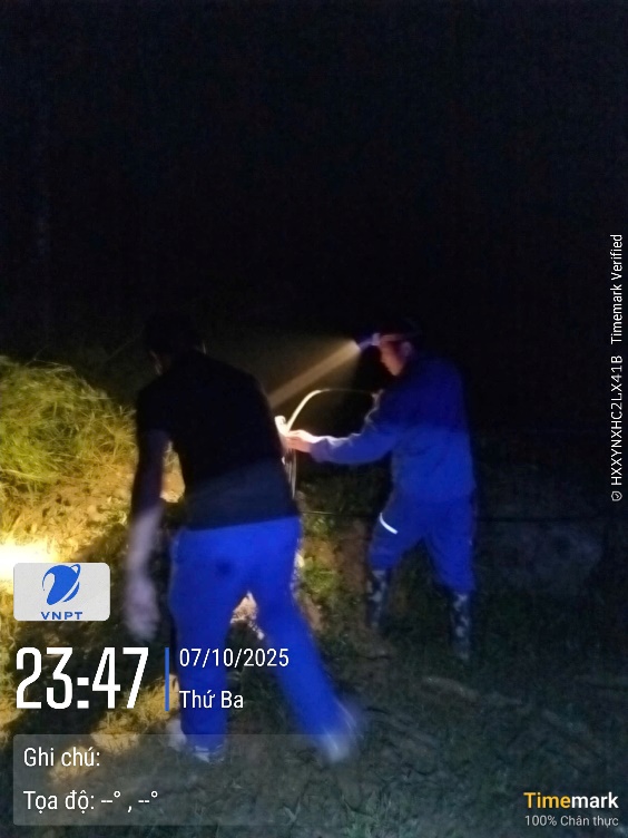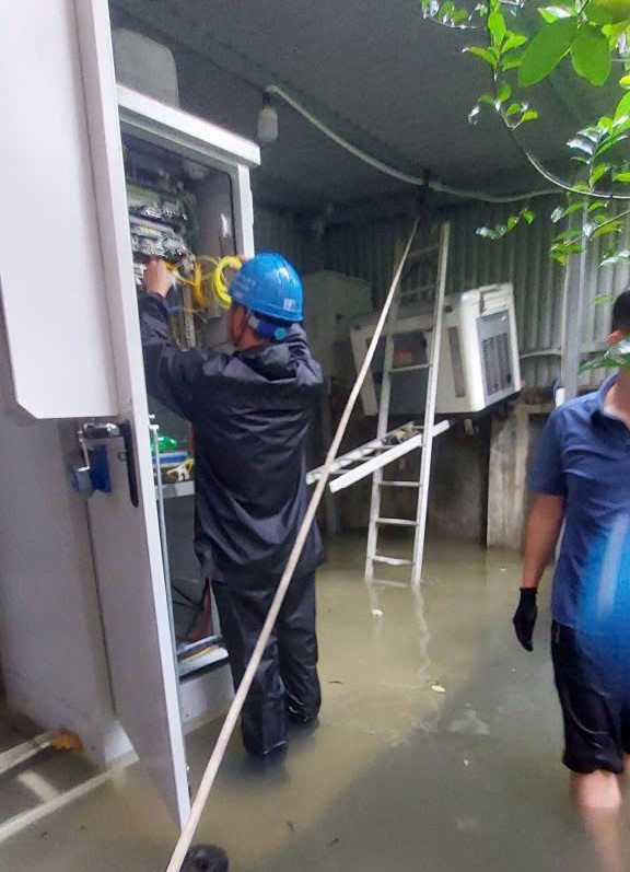 Các nhân viên kỹ thuật VNPT Thái Nguyên vẫn triển khai ngay công tác ứng cứu mạng lưới ngay trong mưa lũ
