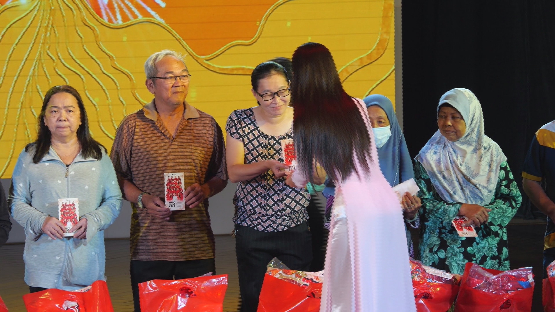 Bà Vân Aminat, sống tại Quận Bình Thạnh, TP.HCM chia sẻ ''tôi là người dân tộc Chăm. Khi nhận được giấy báo nhận quà tôi rất vui, vì tôi biết các cấp chính quyền quan tâm đến chúng tôi. Phần quà này giúp ích cho gia đình nhiều lắm, hi vọng gia đình sẽ có cái tết vui vẻ.