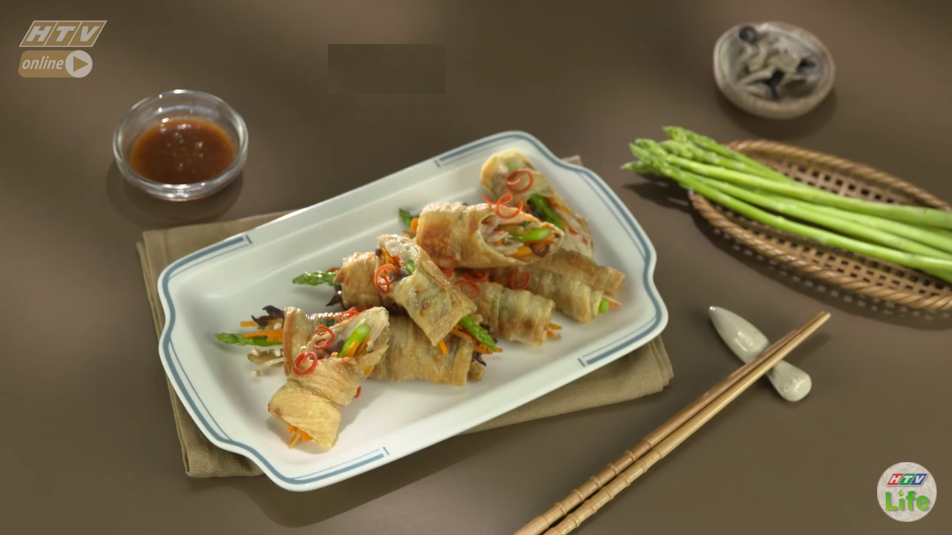 - Chiên: Cho vào chảo ít dầu, chiên các cuốn tàu hủ cho vàng bên ngoài. Khi vàng giòn bên ngoài thì vớt nước ra để ráo dầu.