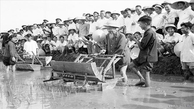 Chủ tịch Hồ Chí Minh đến thăm và tham gia tát nước chống hạn cùng nông dân xã Đại Thanh, Hà Đông (nay là Hà Nội), ngày 12/1/1958. (Ảnh: TTXVN)