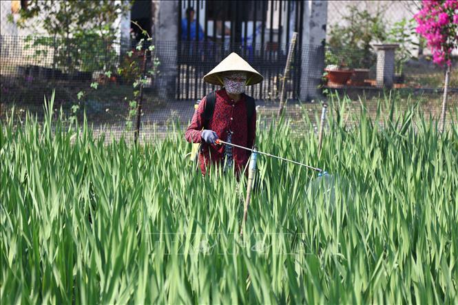 Người trồng hoa lay ơn ở xã Xuân Lộc tỉnh Đồng Nai phun thuốc phòng bệnh đốm lá văn cho cây. Ảnh: Lê Xuân/TTXVN