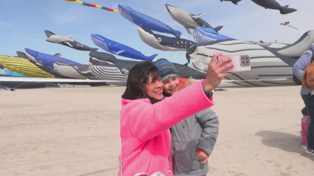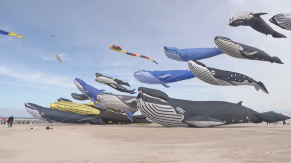 20 chiếc diều hình cá voi bay cùng lúc trên bầu trời trước sự tán thưởng hào hứng của hàng ngàn người tham dự tại lễ hội