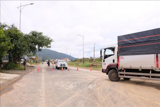 Lực lượng chức năng lập chốt chặn trước đoạn ngập, hướng dẫn xe ô tô di chuyển bằng đường cao tốc Liên Khương - Prenn để đảm bảo an toàn.