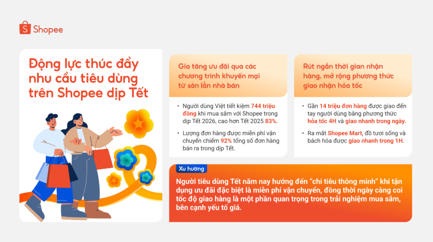 Cùng với ưu đãi, tốc độ giao nhận trở thành yếu tố quan trọng trong trải nghiệm mua sắm Tết. Shopee ghi nhận gần 14 triệu đơn hàng được giao qua các hình thức giao nhanh trong ngày và hỏa tốc 4 giờ, đáp ứng nhu cầu mua sắm gấp rút trong mùa cao điểm.