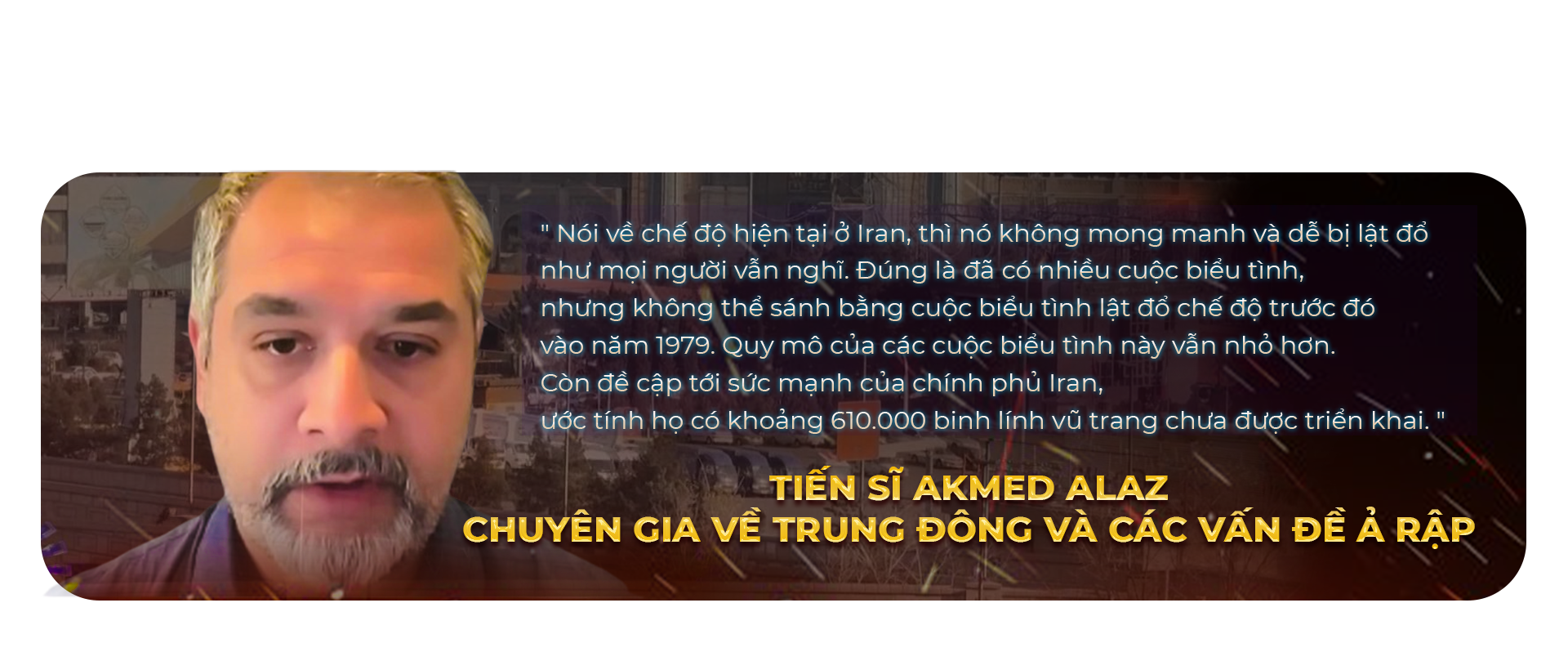 Phó giáo sư Kamran Matin – Đại học Sussex, Anh cho biết: "Tôi nghĩ mục đích của Tổng thống Trump là thay đổi thái độ của chính quyền Iran, chứ không nhất thiết thay đổi chế độ. Mỹ đã tận dụng cuộc biểu tình và áp lực tâm lý mà họ áp đặt lên Iran nhằm ép buộc nước này nhượng bộ, chủ yếu liên quan đến chương trình hạt nhân và tên lửa. Mỹ muốn Iran chấm dứt làm giàu uranium và hạn chế tầm bắn tên lửa để Israel không gặp nguy hiểm".