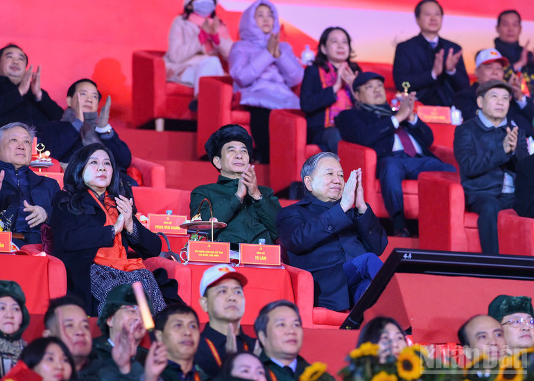 Đồng chí Tổng Bí thư Tô Lâm dự chương trình. Cùng dự chương trình, có nguyên Tổng Bí thư Nông Đức Mạnh, các đồng chí Ủy viên Bộ Chính trị: Thủ tướng Phạm Minh Chính; Chủ tịch Quốc hội Trần Thanh Mẫn; Thường trực Ban Bí thư Trần Cẩm Tú; Chủ tịch Ủy ban Trung ương Mặt trận Tổ quốc Việt Nam Bùi Thị Minh Hoài...