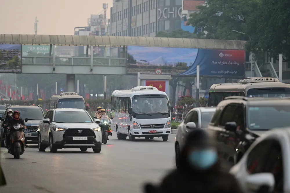 Từ 7 giờ đến 7 giờ 30, từng đoàn xe của lực lượng cảnh sát giao thông bắt đầu mở đường, dẫn đoàn xe đưa đón đại biểu di chuyển về Trung tâm Hội nghị quốc gia.