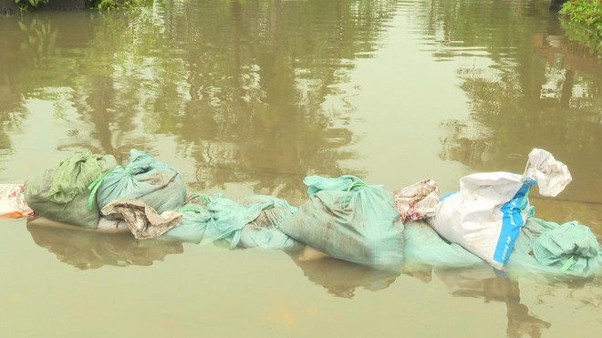 Lực lượng dân quân và người dân đang khẩn trương chuẩn bị khoảng 2.000 bao cát để gia cố những đoạn bờ sông có nguy cơ tràn, sạt lở