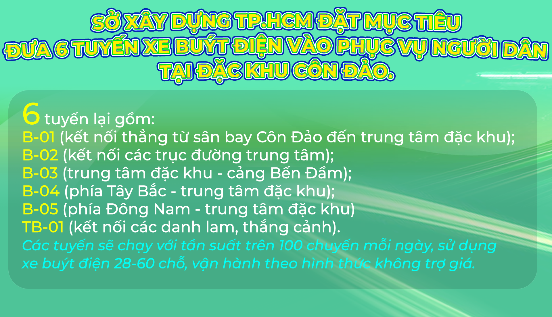 Theo Sở Xây dựng TP. Hồ Chí Minh, thành phố đặt mục tiêu triển khai 6 tuyến xe buýt điện vào phục vụ cho người dân tại đặc khu Côn Đảo.