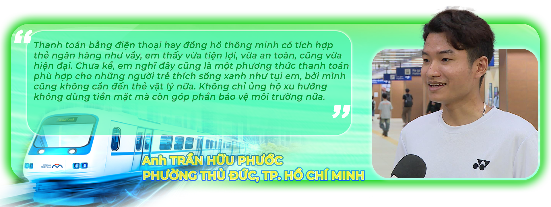 Anh Trần Hữu Phước - phường Thủ Đức, TP. Hồ Chí Minh cho biết anh đã quen với hình thức thanh toán thông minh từ lâu. Chỉ cần chiếc đồng hồ có tích hợp thẻ ngân hàng, hệ thống sẽ tự động trừ tiền vé, giúp anh không cần mang theo tiền mặt hay mất thời gian tìm tiền lẻ như trước.