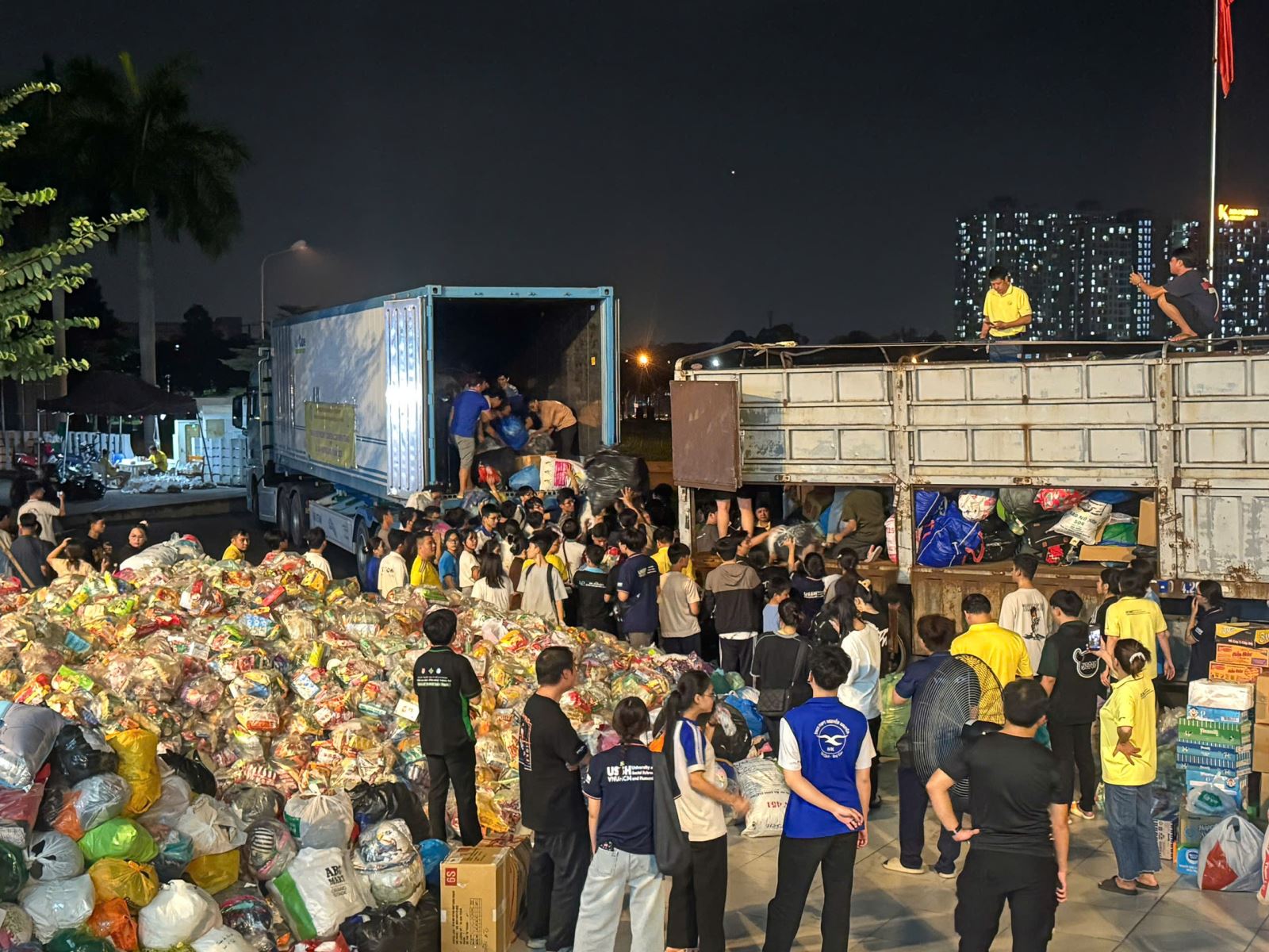 Sinh viên các trường Đại học, Cao đẳng tại TP Hồ Chí Minh tranh thủ cả đêm bốc dỡ, sắp xếp hàng hoá và nhu yếu phẩm gửi đến bà con miền Trung bị bão lũ.