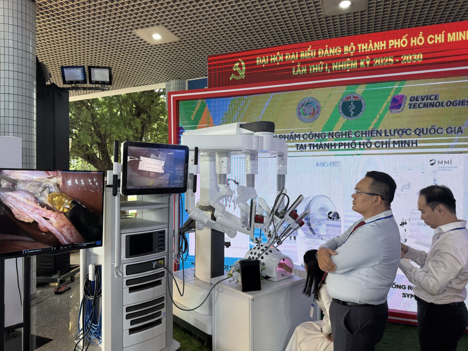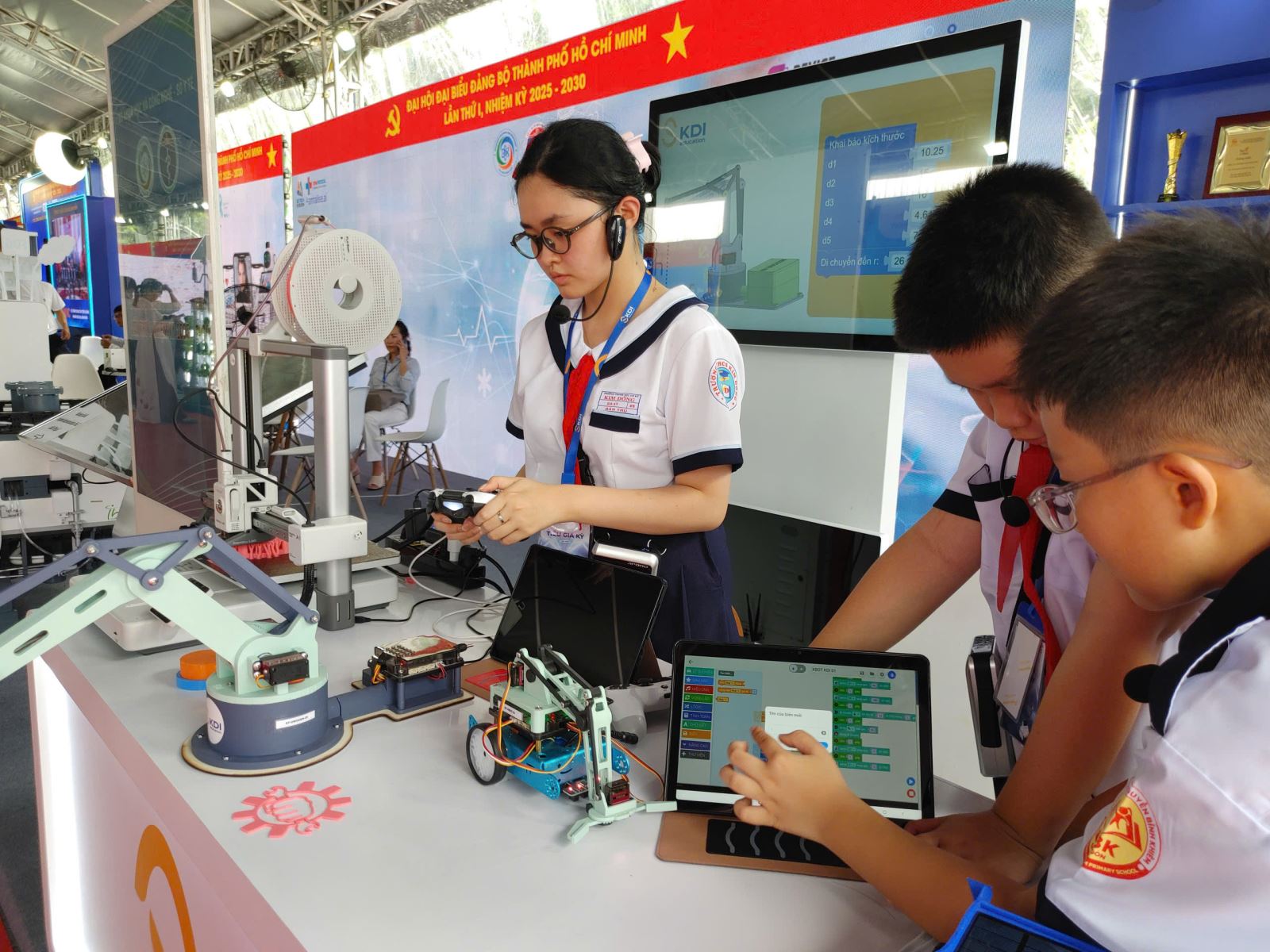 Các em học sinh trải nghiệm ứng dụng khoa học công nghệ trong khuôn khổ Đại hội Đại biểu Đảng bộ TP. Hồ Chí Minh lần thứ nhất