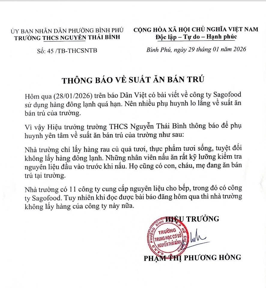 Thông báo của Trường THCS Nguyễn Thái Bình (phường Bình Phú) về việc dừng lấy hàng của Công ty Sago Food.