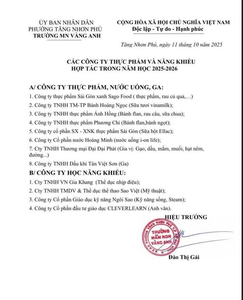 Thông báo của Trường Mầm non Vàng Anh (phường Tăng Nhơn Phú) về các công ty cung cấp thực phẩm.