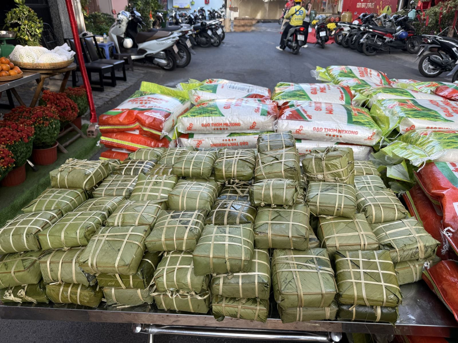 Mỗi phần quà Tết gồm có một chiếc bánh chưng, gia vị và một bao gạo