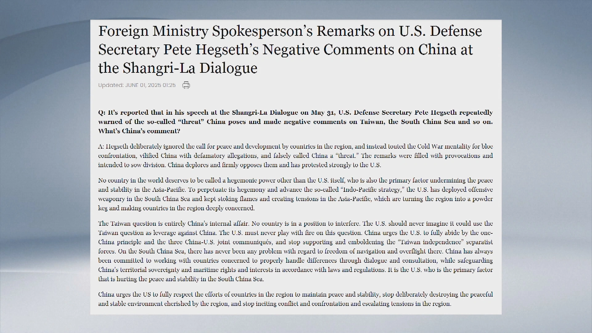 Theo Đài Truyền hình Trung ương Trung Quốc, trong bài phát biểu ngày 31/5 tại hội nghị cấp cao quốc phòng và an ninh, ông Hegseth được cho là đã nhiều lần mô tả Trung Quốc là mối đe dọa và đưa ra những bình luận chỉ trích về nhiều vấn đề trong đó có đảo Đài Loan và Biển Đông.