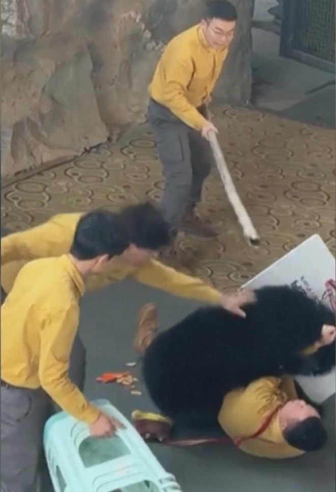 Các nhân viên đã nhanh chóng can thiệp, cố gắng khống chế con vật và kéo nó ra khỏi người đàn ông. Sau khi được tách ra, người huấn luyện có phản ứng định đánh lại con gấu trước khi được đồng nghiệp can ngăn.